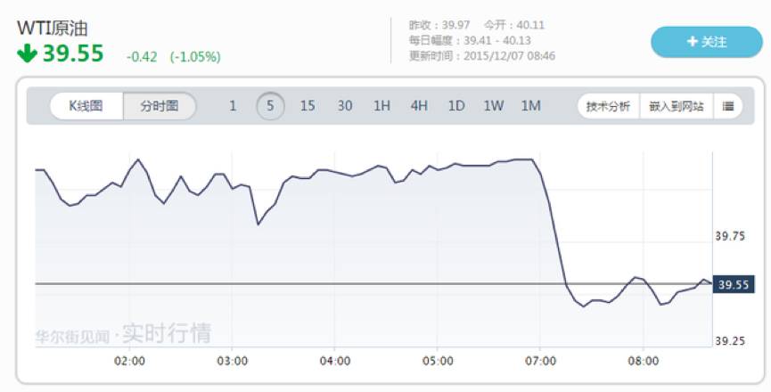 上周五石油输出国组织(OPEC) 会议在激烈的争吵中结束,会议未就石油产量上限达成新协议令市场担忧加剧。周五WTI油价便重挫2.7%,今天早盘跌幅一度扩大到1.9%,油价继续下挫跌破40美元。(华尔街见闻)