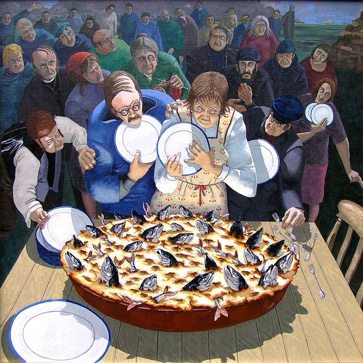 后来这道菜发扬光大了,配料上也有了更多变化,除了鱼肉,还可以加入培根、鸡肉或者兔肉,调味也尽可按照个人喜好做调整。不过不变的是,鱼头永远要露在外面,保留“祈祷”之意外,还有一个更实用的目的:烘烤时,鱼身上的油脂会顺着鱼头的弧度渗回派内,让内馅的味道更浓郁。
