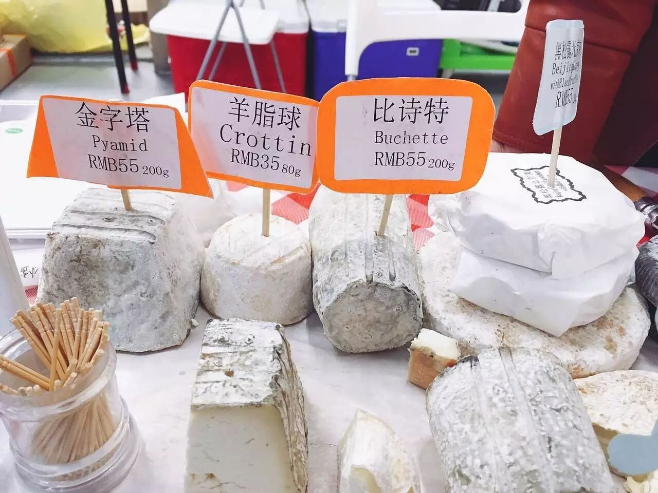 布乐奶酪坊的摊位展示了许多不同口味奶酪,可以试吃