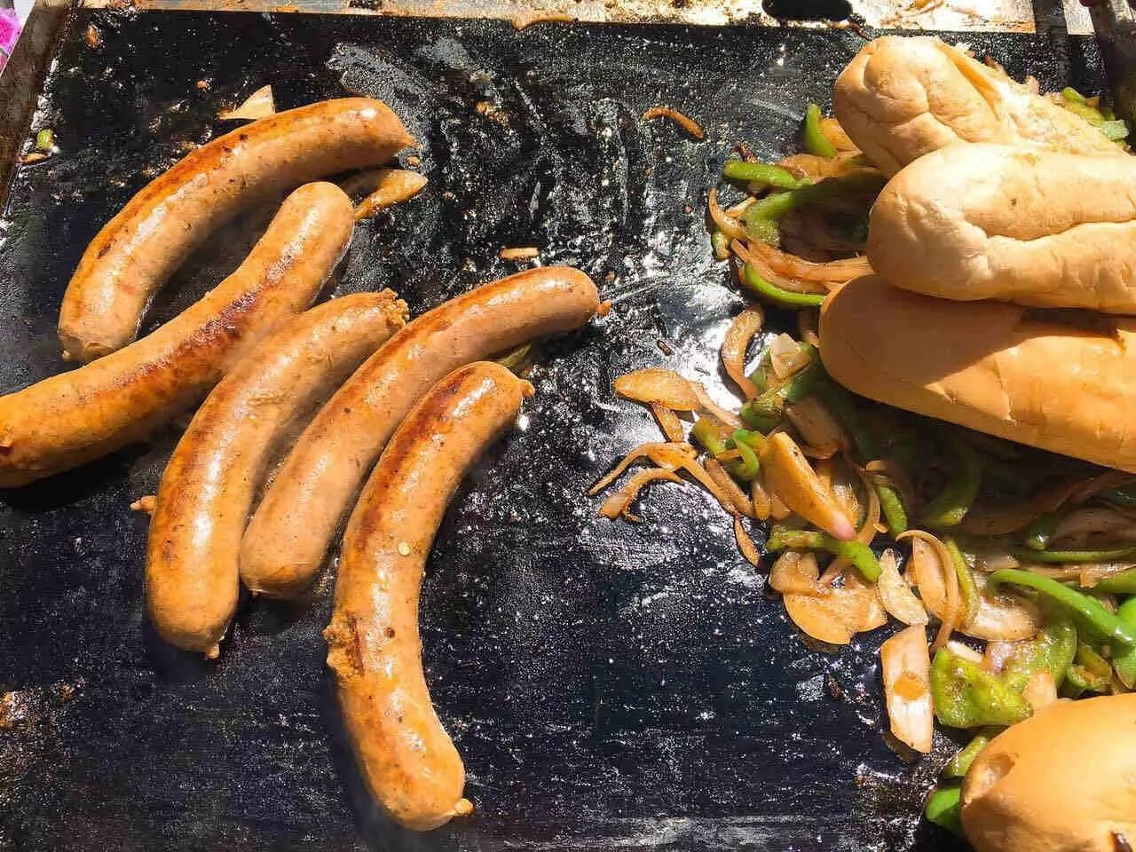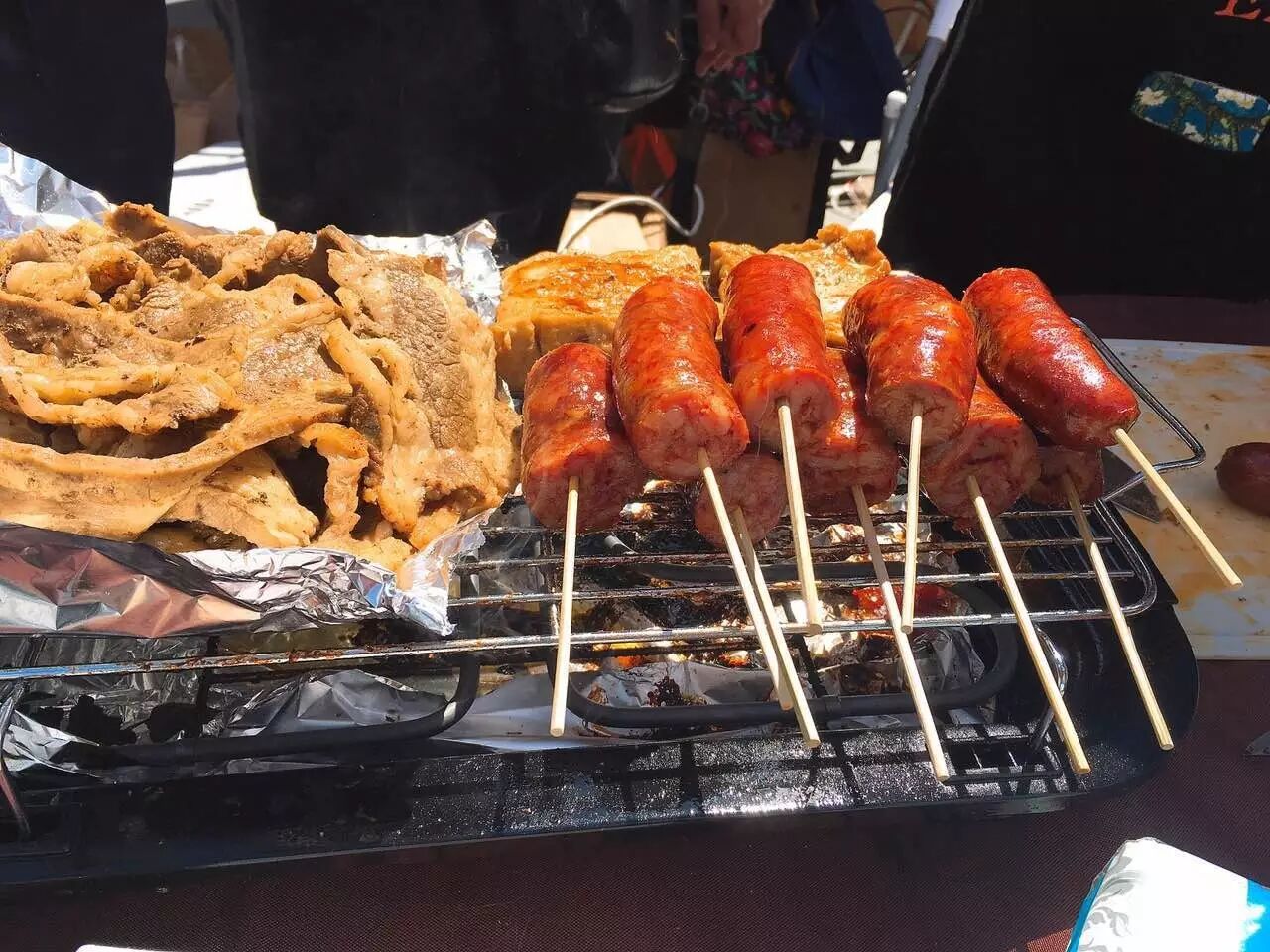 集市里有许多卖烤肠的,加拿大烤肠,美式烤肠等等