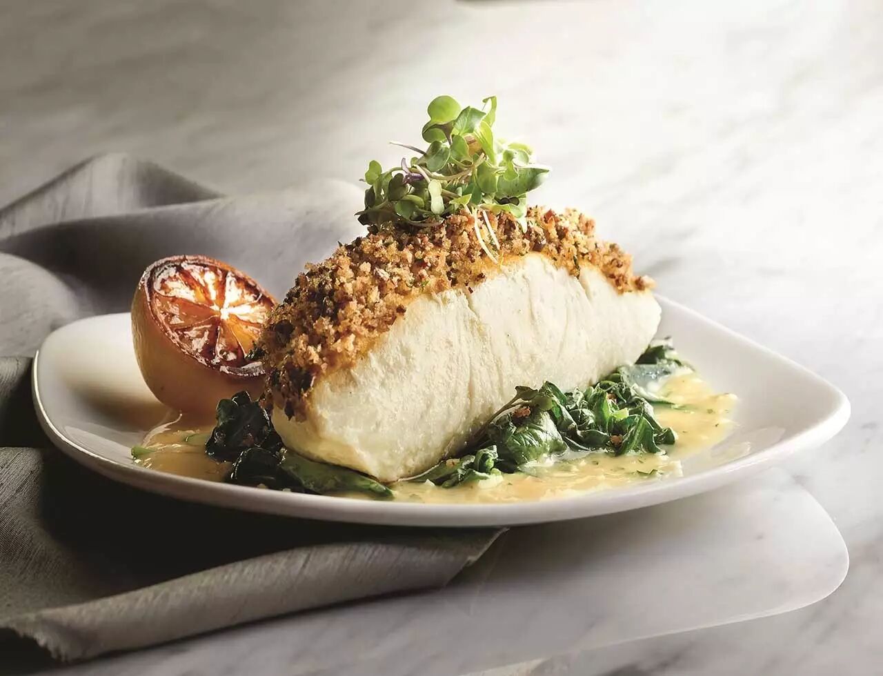 一整块阿拉斯加比目鱼煎得白白嫩嫩,以经典的蒜香奶油白酱调味,底部浸润着柔软的菠菜,整道菜绵软熨帖的口感非常和谐。主厨还别出心裁地点缀了特制的黑橄榄酱和新鲜豆苗,一咸一淡,其颗粒感和清脆度也丰富了层次。