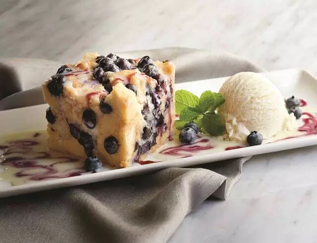 扎实柔软的面包丁被浓郁香甜的白巧巧妙地融合在一起,烘烤过后喷香温热,配上微酸的蓝莓、清新的薄荷和沁凉的香草冰淇淋,甜蜜翻倍,格外安慰。这道是非常典型的美式搭配,吃完特别罪恶,也特别美满。