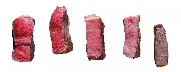 ③ 选熟度。从上图我们可以看到牛排5档熟成度的外观区别,但国内西餐厅可能对几分熟有不同的温度理解,你点到的可能不是你期待的。梦厂建议,选择五分熟(Medium)是最保险的,对“血色”没有心理阴影的还可以尝试三分熟(Medium Rare),同时大胆地跟主厨沟通合适的熟成度,就一定能选到肉汁细嫩、肉汁丰盈,又不过生的好牛排。