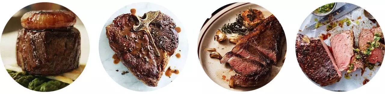 ② 选部位。首先我们要明确一个概念:对牛排来说,肉质的嫩度和风味的多寡,往往是成反比的。在牛肉的所有部位当中,按肉质从嫩到老,风味从淡到浓,应该是这个顺序:菲力(Fillet Mignon)——T骨(T-bone,一边西冷一边菲力)——西冷(Sirloin)、纽约客(New York Strip)——肋眼(Rib Eye)。
