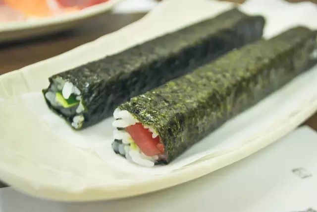 先从相对来说简单些的细卷学起。我们做的是细卷中比较主流的黄瓜卷和金枪鱼卷,行话唤作河童卷和铁火卷。把海苔放置在卷帘中央,用手指轻拨,将饭团在海苔上摊平,注意海苔的边缘要留一小条空隙,这是为了之后卷起海苔时边缘能平整地贴合。接着用手指蘸一点儿芥末,抹在米饭中央一条,放上黄瓜条或者金枪鱼条,从下往上卷起卷帘。