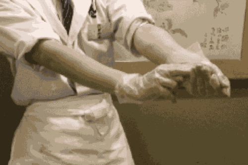 换上一身料理服,戴上手套,正式开始学捏寿司。(寿司师傅真实捏制寿司的时候是不戴手套的,这里怕我们指甲及手的卫生不合要求,就统一戴了无菌手套)