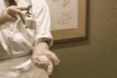 右手取一小坨米饭,左手取准备好的鱼,置于手指关节上,右手食指蘸一点芥末抹在鱼中间。把饭团扣在鱼肉上,右手食指在饭团中间轻按,再把散开的米饭重新归拢。接着,把右手上的寿司翻转过来置于左手拇指和食指间。