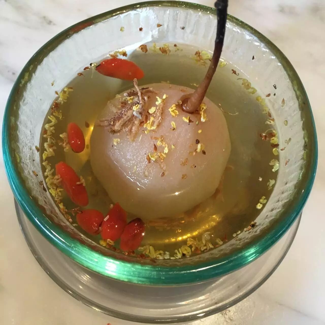 吃完点心,当然要有甜点才完满。这道传统的中式甜点以原个梨子加入陈皮炖煮, 还加了杞子和桂花增添色香味。糖水甜而不腻,陈皮味浓郁,梨子也炖得软烂, 喝一整碗也不觉太甜腻。
