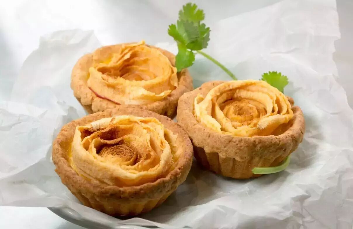 苹果和蛋挞也能crossover?这道甜点将富士苹果切成薄片,卷成玫瑰花的形状。蛋挞的滑,酥皮的松化加上苹果的酸甜,口感层次丰富感人。