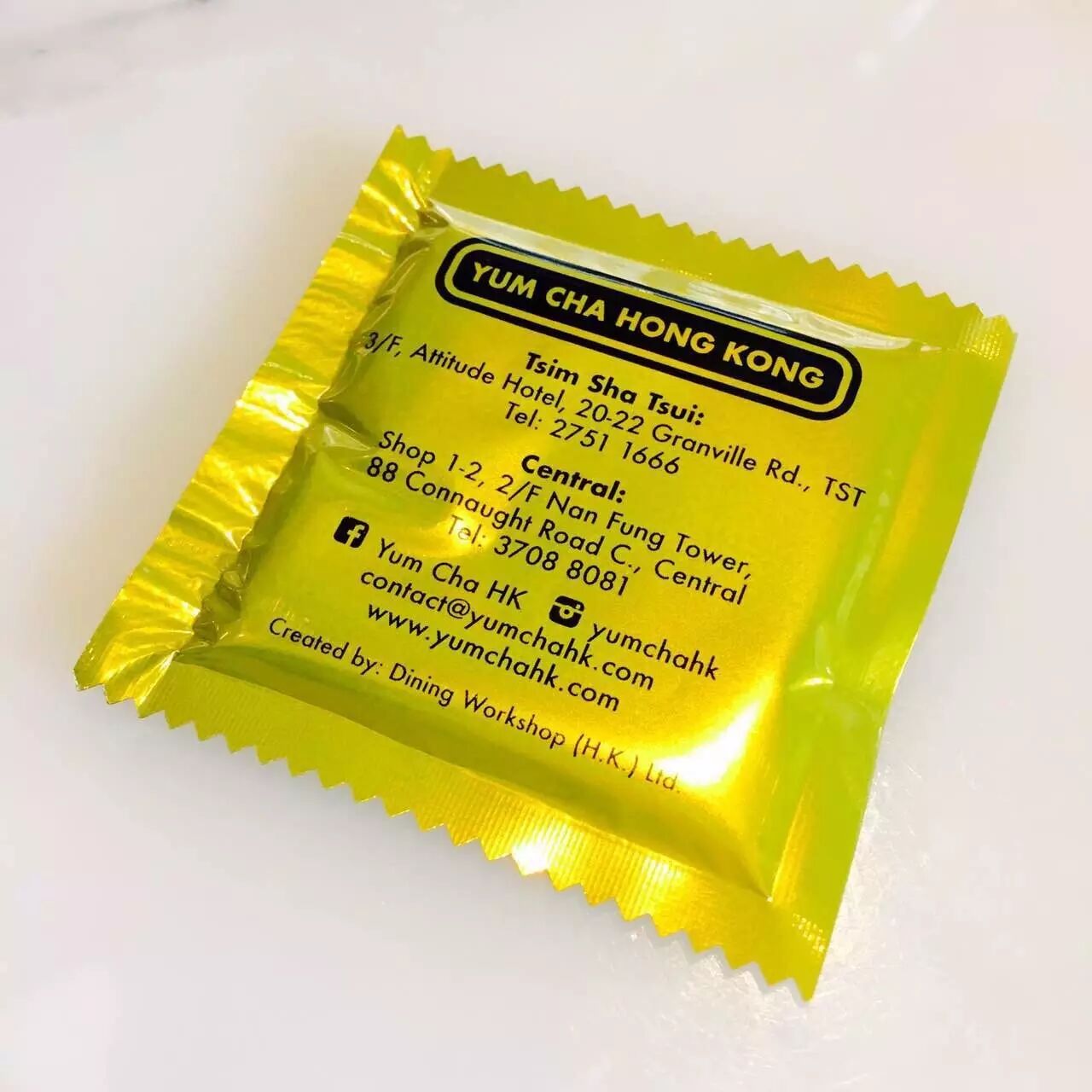 当时买单时服务员递过来这个小包包,差点想歪!其实是安全套套造型的湿巾,背后还贴心的印上了两家店铺的地址。