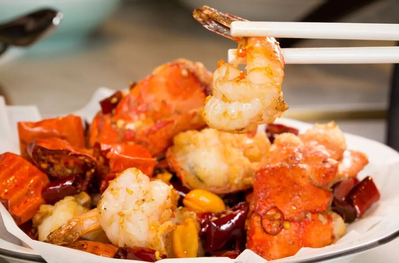 夏天当然要“热辣辣”才过瘾!美国龙虾和鳯尾虾再加入辣椒干、指天椒、辣椒油和花椒油爆炒,虾肉弹牙可口,香辣惹味。