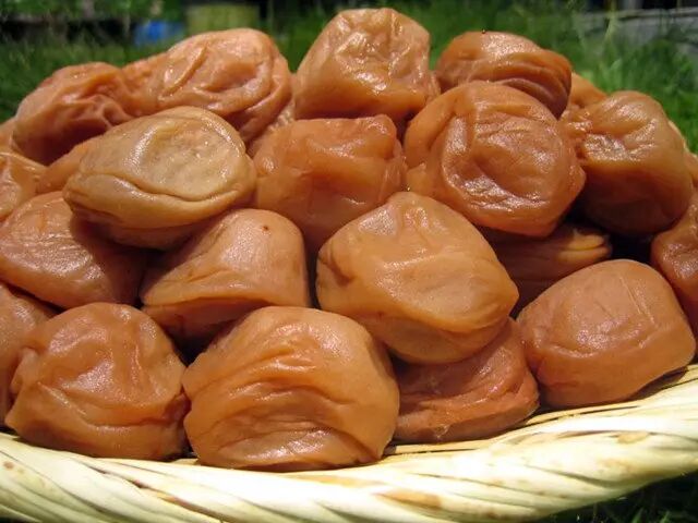 梅干制法:成熟的梅子洗净、将梅子和食盐一层层地铺入用烧酒消毒过的容器里、梅子上面压上石头、大约一个月时从梅子里腌出压出的水分(梅醋)淹没了梅子、取出梅子擦干后放平底竹箩晾晒三四天即可。