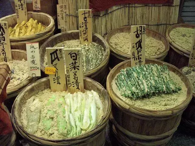 这里说的米糠,是米糠煮沸或炒热,冷却后掺进低浓度的食盐水、经过充分发酵而做成的“糠床”。在糠床里埋一夜的渍物叫“浅渍”,埋了许多日子的叫“古渍”,你可以看着木桶里插的字牌依自己喜好购买。在百货店的食品部有着包装精美的糠渍腌菜,可买作礼品。在超市里有密封包装的糠床卖,可供小家小户自己做糠渍。让黄瓜茄子睡进糠床谁都会,但切记那糠床得经常倒腾使它常透空气。
