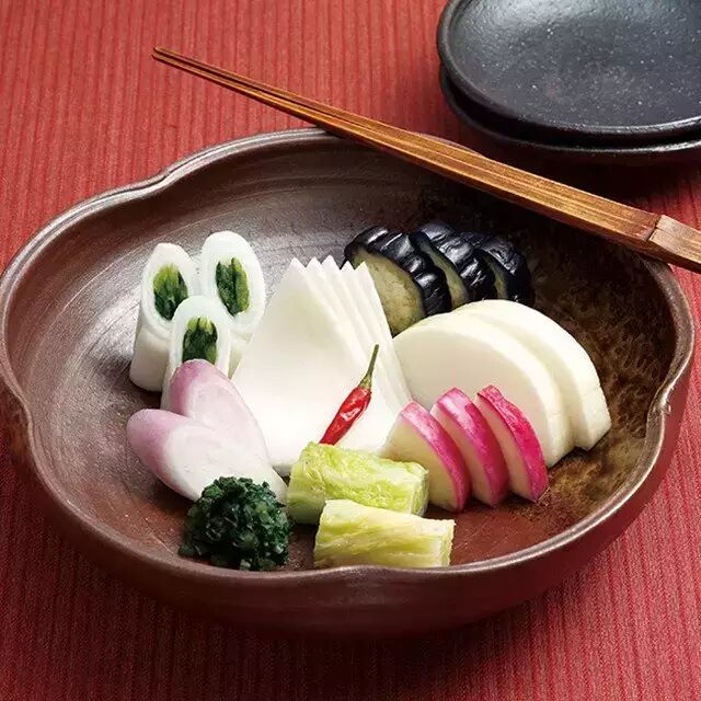 其一是它的存在和地位:家庭餐桌、饭店酒席、皇室御膳,它都上得去。鱼生店、寿司店、鳗鱼店、烤肉店等专门店里,也总会有它。春夏秋冬有它,连正月过年装在多层多格的“重箱”里的“御节料理”里也有它。也有属于它的几个格子是放渍物的,可以说日本腌菜是每日均食、无处不在、无论贫贱与高贵。