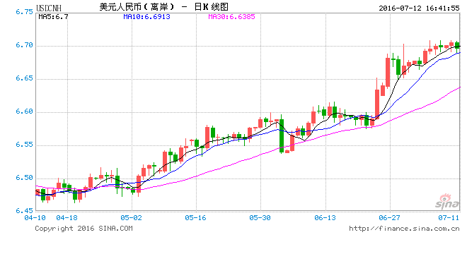 7月12日,央行公布人民币兑美元汇率中间价报6.6950,贬值107点,创下2010年10月以来新低。(新浪财经)