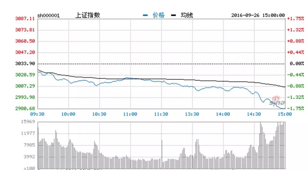 9月26日消息,周一早盘沪深两市双双低开,上周强势的次新股板块深陷泥潭。临近尾盘,沪指跌幅继续扩大,3000点宣告失守。盘面上,各大板块全线飘绿,两市超过2400股下挫。截至收盘,沪指报2980.43点,跌幅1.76%;深成指报10392.7点,跌幅2.05%;创业板报2122.9点,跌幅1.56%。成交量方面,两市共成交4252亿元。(新浪财经)