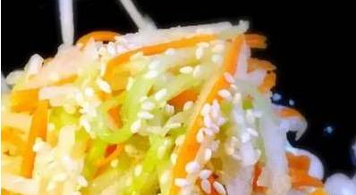 原料:梨、黄瓜、胡萝卜、盐、白醋、芝麻油、熟白芝麻