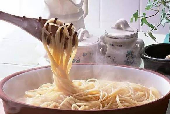 相反,如果水沸了再下挂面,面条表面易粘糊,水分、热量不能很快向里渗透、传导,再加上沸水使面条上下翻滚、相互摩擦,这样煮出的面条外粘、内硬、汤糊。