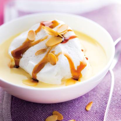 蛋白打发煮熟后放在蛋奶酱上,撒上杏仁片,淋上焦糖,就可以做出最简易的漂浮岛。蛋白霜源自于意大利,蛋奶酱来自于英国,法国人把两者结合就发明了漂浮岛。