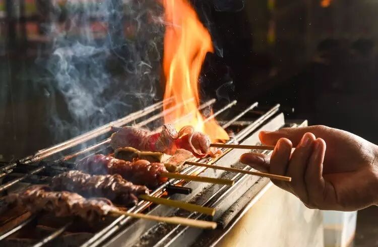 好的烧鸟店一般会使用备长炭(びんちょうたん)作为原料。备长炭的火力更足,肉串表面的“美拉德反应”更充分。高温之下表面焦化酥脆、内里饱含汁水,让烧鸟的口感更富有层次。