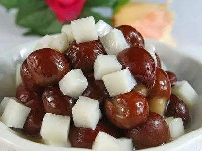 2、荔枝剥去外皮去核,清洗干净,马蹄洗净去皮切成小块状备用。