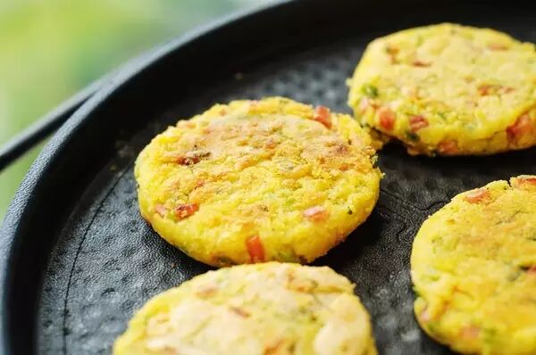 食材:玉米面80g、豆腐渣150g、精盐1/3茶匙、火腿、菜叶