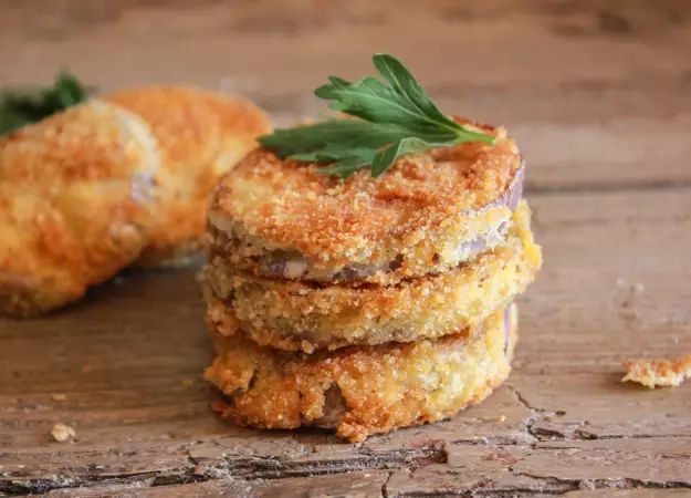 材料: 1杯玉米淀粉、2个鸡蛋、1/2茶匙盐、1/2茶匙胡椒粉、1杯面包屑、2条紫茄子,植物油、柠檬适量。