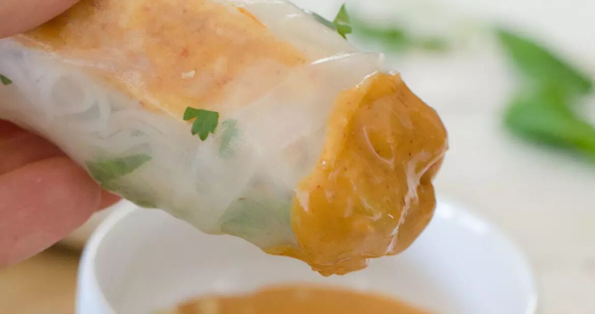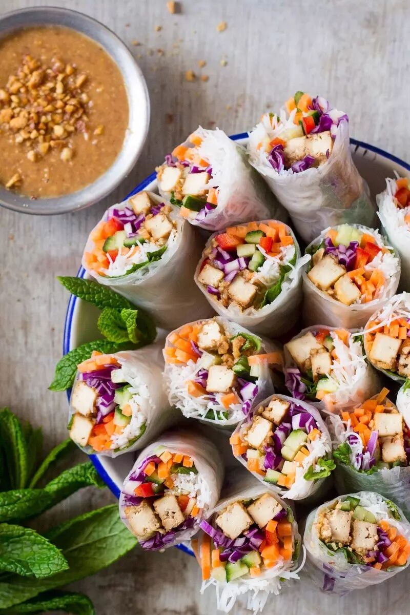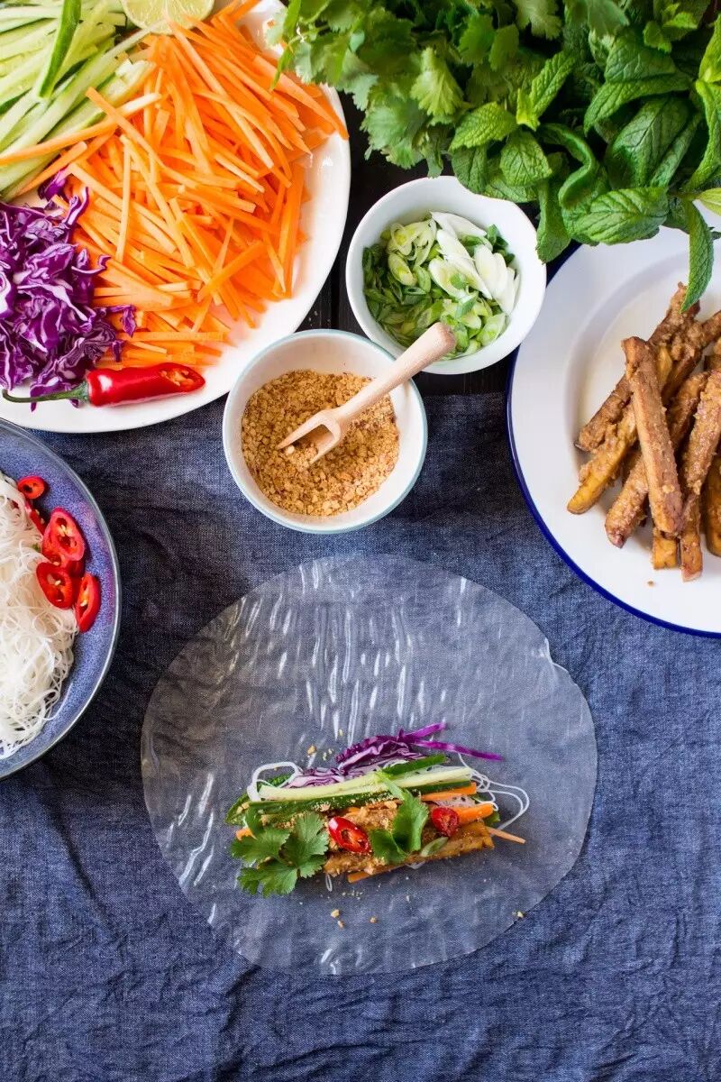 材料 1根胡萝卜、200g豆腐、1 / 4棵紫甘蓝、2个彩椒、3根葱、米纸(可用春卷皮代替)、一小捆香菜、几片薄荷叶(可选),花生碎、芝麻酱、盐、胡椒粉、酱油、蒜瓣适量。