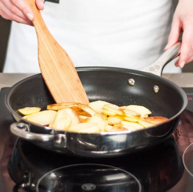 3.煎锅中加植物油(比平时炒菜略多),待油热后放入土豆炸至熟软。然后把多余的油盛出来~
