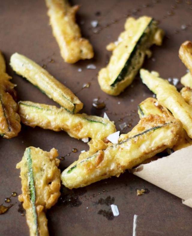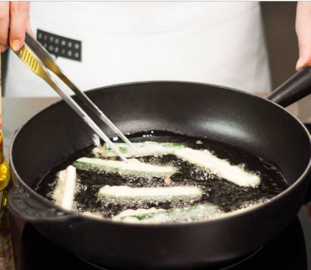 4.油锅烧热,下西葫芦条炸3-5分钟,注意保持中火哦~然后捞出沥油就完成啦!