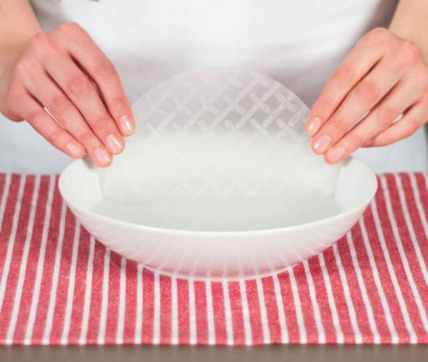 3.将米纸(可用春卷皮代替)浸入水中约一分钟,然后取出稍稍晾干,铺在盘中待用。