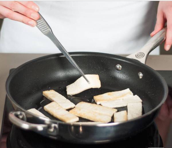 2.豆腐切成长条,下油锅煎至两面金黄,加盐和胡椒粉调味。