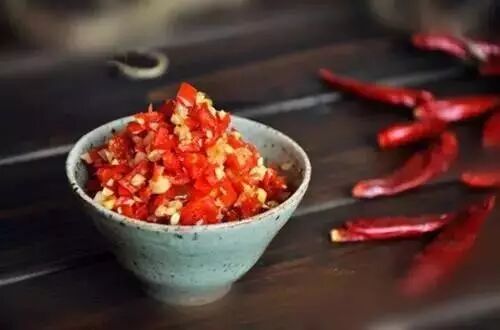 将泡美人椒10.5千克、泡小米辣10千克剁碎;泰椒、鲜红尖椒各5千克切小米粒;大蒜7.5千克打蓉。