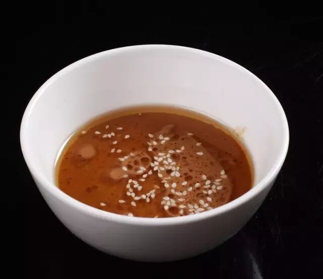 将纯净水2.5千克加鸡精、王致和白豆腐乳各500克,味精、韭花酱、蚝油、白糖各400克搅拌均匀,加纯净水7.5千克,慢慢倒入纯芝麻酱7.5千克,顺时针搅拌均匀,在搅拌过程中,根据麻酱的纯度来调节克数(纯度高就少加,纯度低就多加),最后下幺麻子藤椒油150克即可。