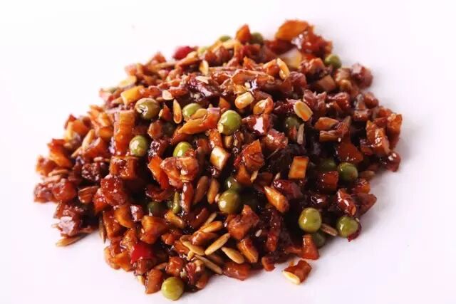 葱、姜、蒜各4千克剁碎;圆葱4千克切粒;红皮花生米20千克打成半颗粒状碎;永川豆豉1千克剁碎;郫县豆瓣酱5千克剁碎;青尖椒10千克切小粒。