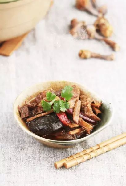 6、下入泡发的腐竹,炒匀后继续煮约5分钟至锅内汤汁基本收干,下入葱段,炒匀即可出锅。 |