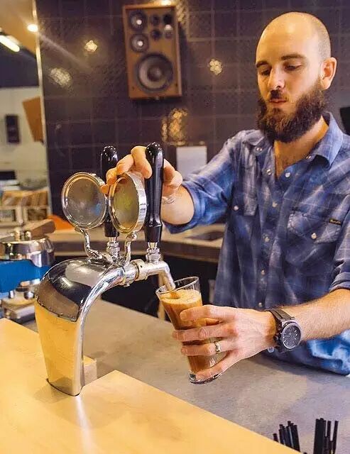 Nitro Cold Brew机器前,Barista把玻璃杯对准出水口,摇动控制杆,啡白的液体落下,在杯底沉淀。杯中物从杯底开始渐渐变成啡黑,看起来似黑啤,喝一口,顺滑如丝,真似黑啤,细意品尝,却有咖啡的酸香回甘。