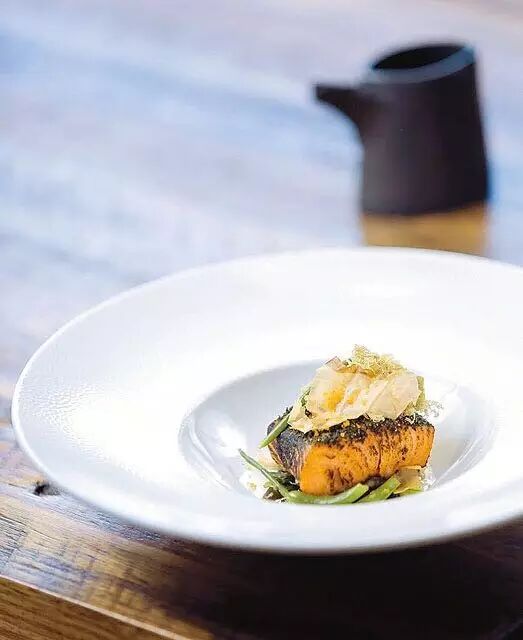 Saint Crispin的菜式味道美感并重,菜单根据当天食材每日更换;比如主菜三文鱼,鱼柳用茶叶烟熏过,再炙烤至微焦,吃起来油润香嫩,表面的芝麻、柴鱼片、乌鱼子碎勾勒出更抓人的鲜甜。