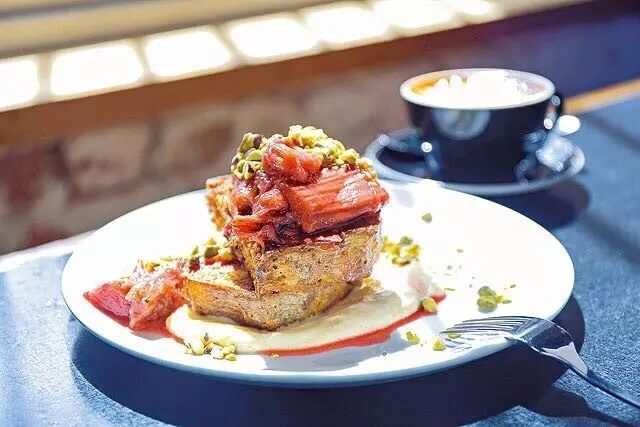 吐司在cafe菜单上十分常见,也是检验cafe水准的一个重要标准。在Three Bags Full有一款令人惊艳的法式吐司;不同于港式多士,白面包蘸着蛋液再炸;这儿的是健康谷物包,两度烘烤,待脆后再裹上蛋液微微煎香,不余油腻只剩香气。以香草奶黄酱为底,以煮软的大黄、开心果仁为面头,集酸甜、软滑、松脆于一身。