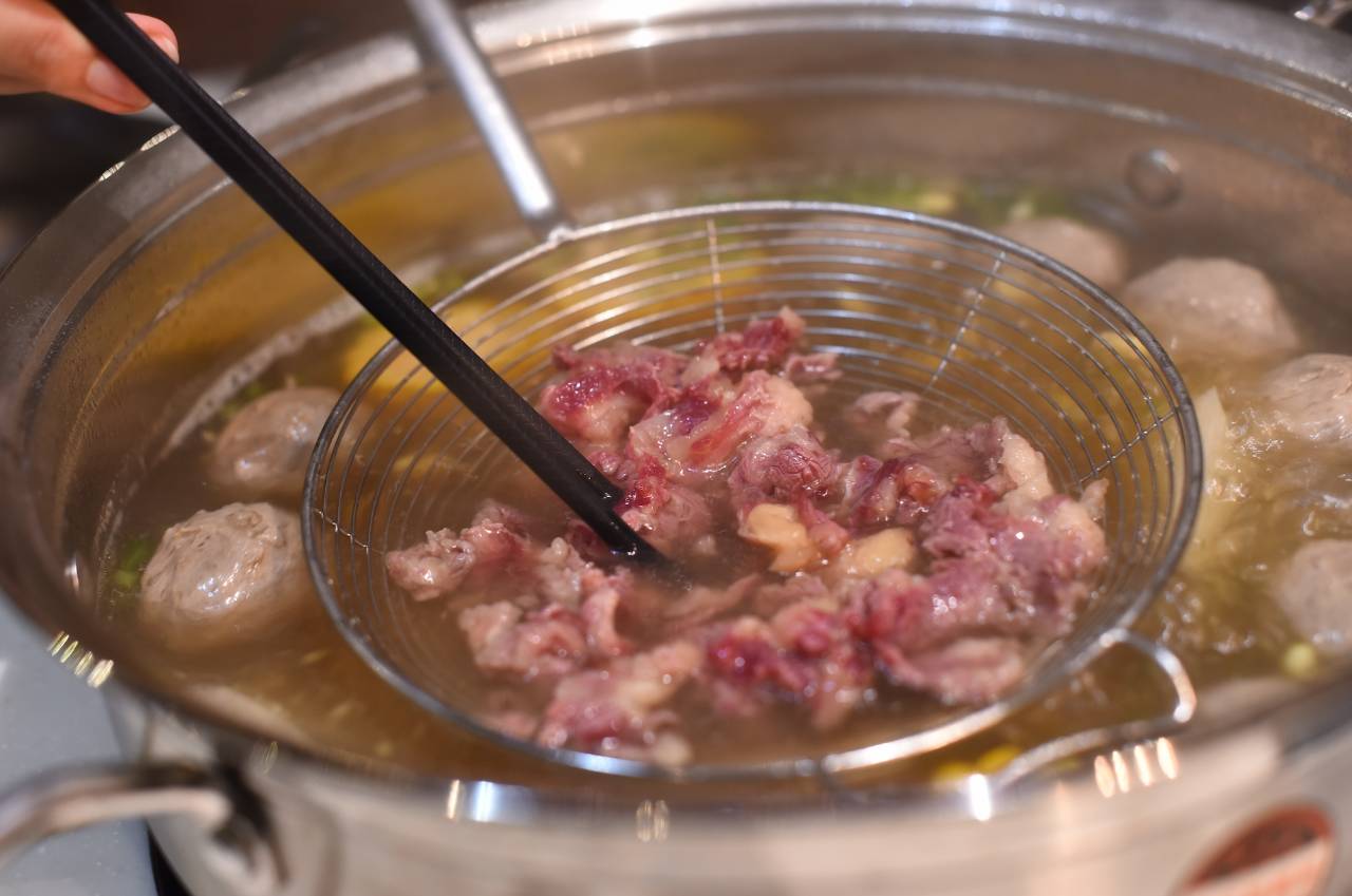 除此之外老板高薪从潮州当地聘请了一生都在当地做牛肉的师傅来处理牛肉,厨师长阿杰今年34岁,14岁开始在当地开始学习宰牛,现在已经成为当地有名的宰牛大师,很多当地餐厅的切牛师傅都是他的徒弟。他对肉的把控要求特别严格,只选用30%的肉,按照潮州当地的选切逻辑来处理肉,牛肉涮品常备12种,肉类新鲜无注水,鲜肉立盘不坠,手打牛筋丸加入原骨汤煮制后,牛肉本味香溢不腥,肉丸含碎筋而弹牙,不输潮汕当地好肉丸。
