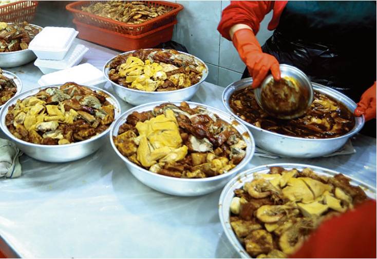 做法现代,好在味道传统。食材从上至下,是萝卜、猪皮、腐竹、冬菇、豆泡、鱼蛋、猪肉、鸡、鸭、虾、鲍螺片。灵魂是加入橙皮、红糖焖制的猪肉,名店树记出品的豆泡、腐竹,煮鲍鱼的方式烹制的鲍螺片,连煮萝卜都下足冰糖和八角。