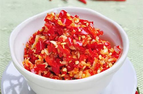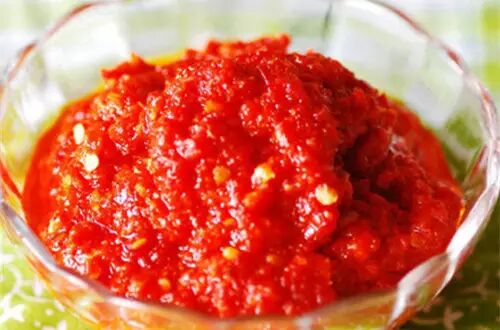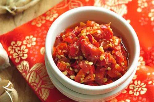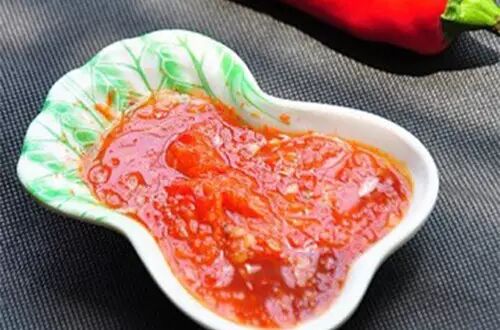 【做法】新鲜的朝天椒,配几只红尖椒(爱吃辣的人可以全用朝天椒),500克番茄,一块姜,两头大蒜。以上各样分别放搅拌机搅成糊状。炒锅放水一小碗,用中火煮,各种糊下锅中,熬酱(蒜蓉留一半最后放)边熬边加盐、糖(少许),米醋小半瓶。切记要不停地用勺搅拌以防粘锅,由稀转稠就可以关火了,然后下点味精,再把剩下的蒜蓉倒进去,凉后装瓶。