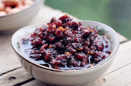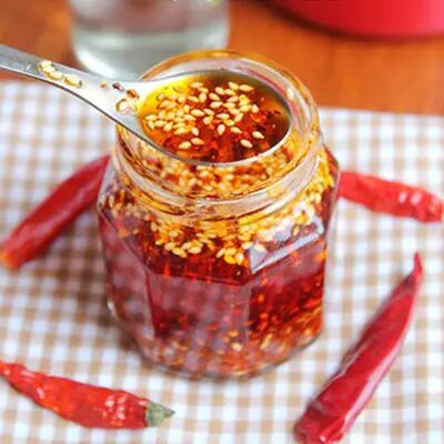 2.另起锅,入菜油,四成热时,下姜片、小葱炸至干香时,熄火,冲入装有糊辣椒末的盆中,搅拌至四成热时,放入花生米、熟芝麻,封口即成。特点 色泽深红,辣味十足。