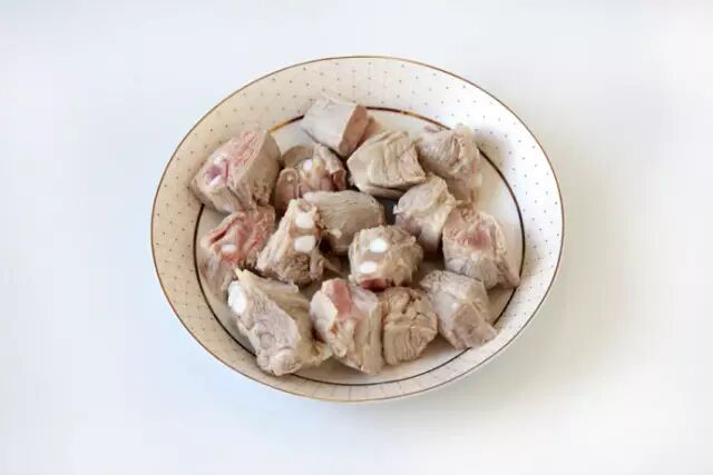 排骨斩成大小适宜的块,冷水入锅烧开,飞水去沫捞出沥干待用。土豆去皮用菜刀根部掰成不规则块状。