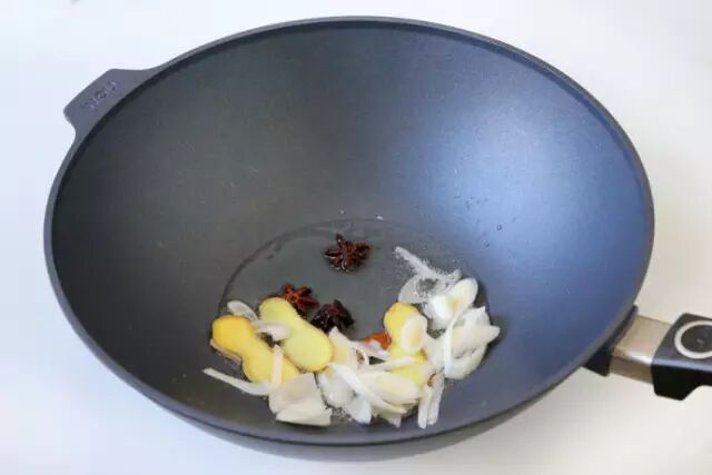 热锅凉油,放入八角与桂皮,小火煸出焦香,下入葱圈与姜片煸香。