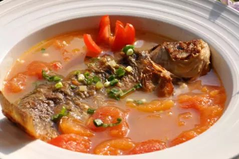鲫鱼 1条、西红柿 2个、小葱 2根、姜 1块、食盐 适量、胡椒粉 少许、黄酒 少许、色拉油 适量