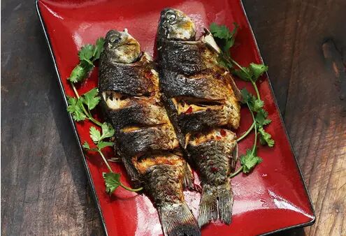 6、刷上一层酱料,预热烤箱200度,放入鲫鱼烤制;10分钟翻面,再刷一层酱料,继续烤制10分钟,取出装盘,即可食用。