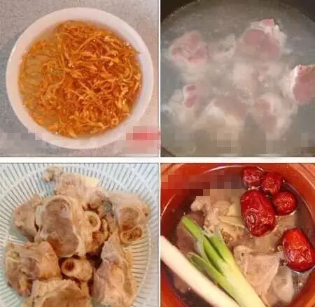 把骨头放入锅中,加入红枣、大葱、花椒和姜片。红枣一般加2-3个就可以了,我今天加了5个,是因为开始加了两个大的,为了对比一下,又加了小的。