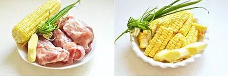筒骨2根;甜玉米1根;姜1块;小葱1小把;盐适量;生抽;