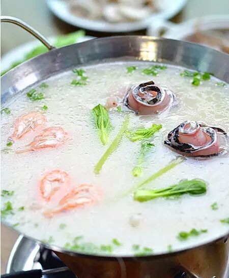 鱼粥煮好后,倒入火锅放入配菜就可以开始涮烫了。